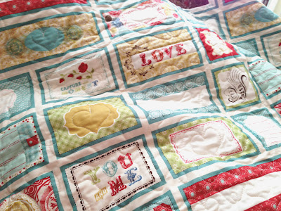 The fabric is designed by a fabulous designer from the company I work for, Moda Fabrics, and is absolutely the PERFECT wedding fabric with sweet phrases like "LOVE", "You & Me", "Capture the Moment" & "Faith" printed on it mingled in with plenty of blank frames for your guests signatures.